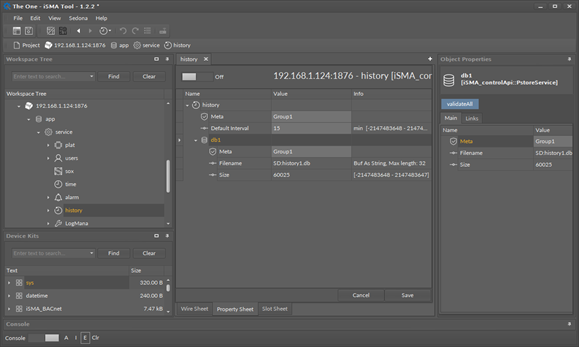 The history service is a component, which is responsible for writing historical values in the microSD memory. The history service is available in the iSMA_controlApi kit palette and the component must be placed under the service folder.