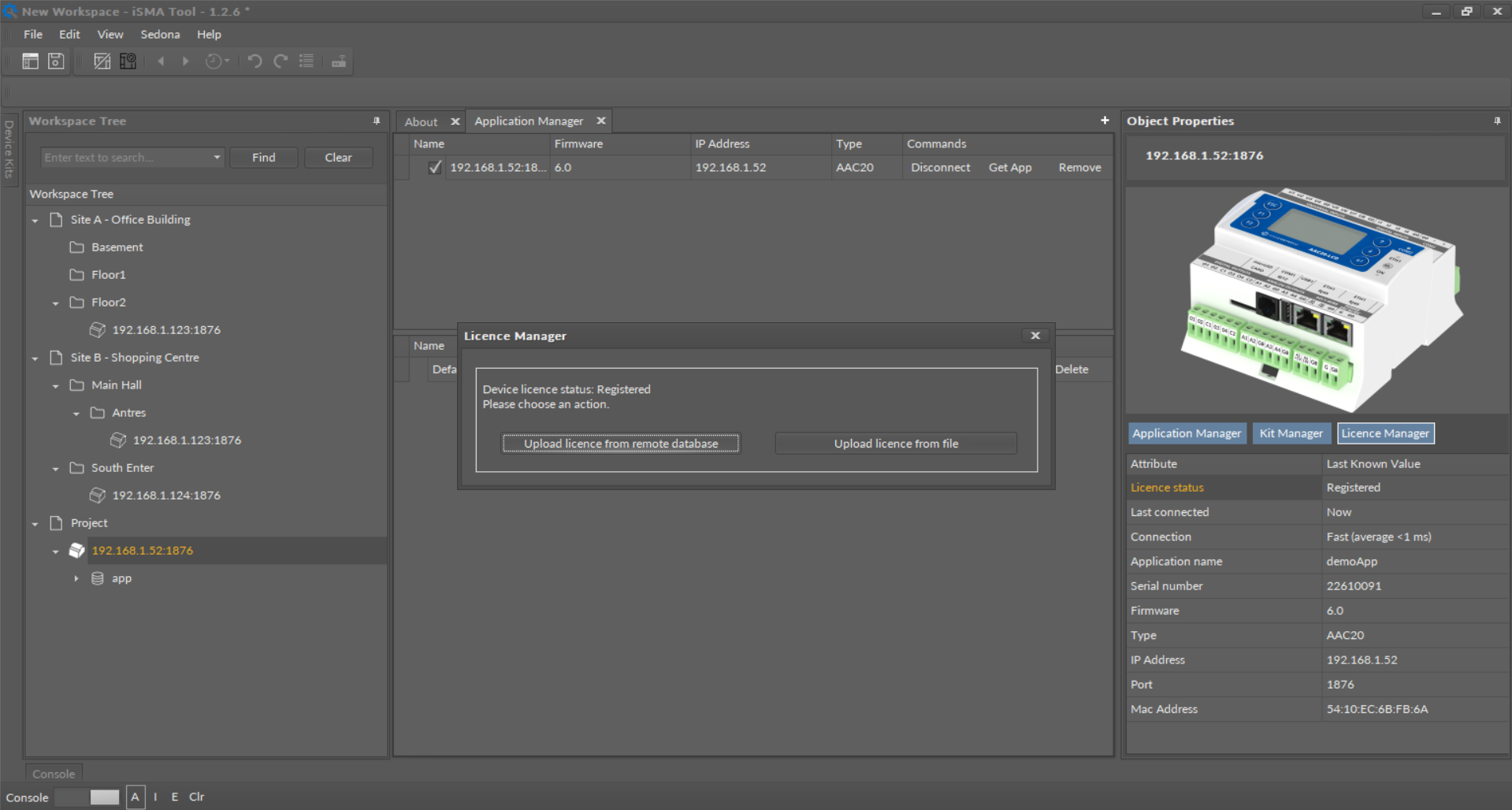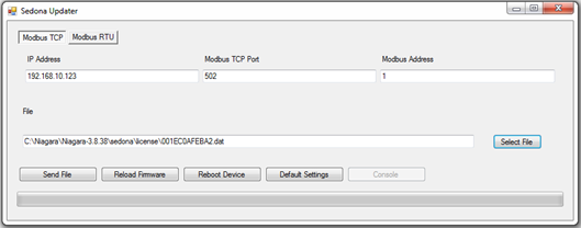 The license can be uploaded to the device offline using either the iSMA Tool’s License Manager or AAC20 Updater. In order to use the offline License Manager, use the Upload License from File option. With the AAC20 Updater software the license file can be download using the ismaUI to local database (for Workbench AX users), copied from another PC, or e-mailed from the local iSMA distributor. Open the SedonaUpdater.exe software and choose the license file (a proper file format is MACAddressWithoutDots.dat). After a successful upload, reboot the controller using the Reboot Device button. (For more information about sending files see Chapter Sending Files to the Device). The new license will be implemented after the controller’s reboot.