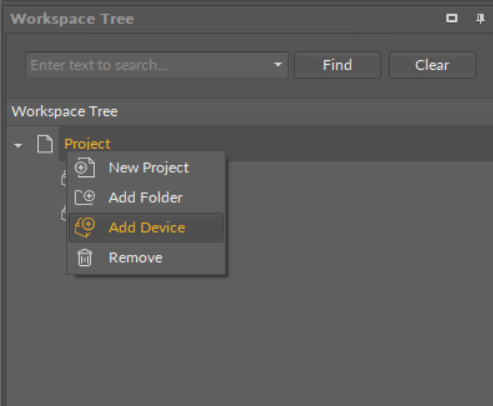 In order to connect to the device, right-click on the project folder and select an Add Device option.
