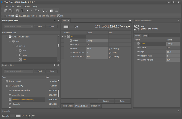 Sox is a standard protocol used to communicate with Sedona devices. The Sox protocol is also used by the iSMA Tool to program controllers. Note that Sox is of a service type and it is executed after application components. Therefore, if a difference between scan period and Scan Time (see App component) is minor, the services do not have enough time to be executed, and the programming interface can slow down. Sox is designed to be run over UDP/IP protocol (default port is 1876).