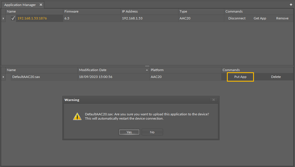 Pressing the Put App button will overwrite the application already installed in the device and reset the device in the final phase of the process.