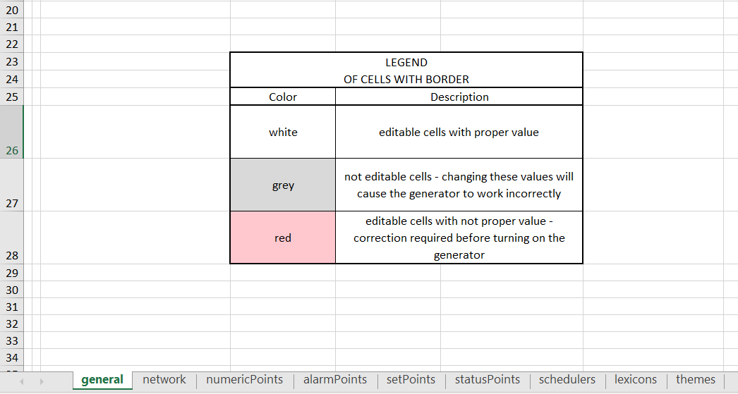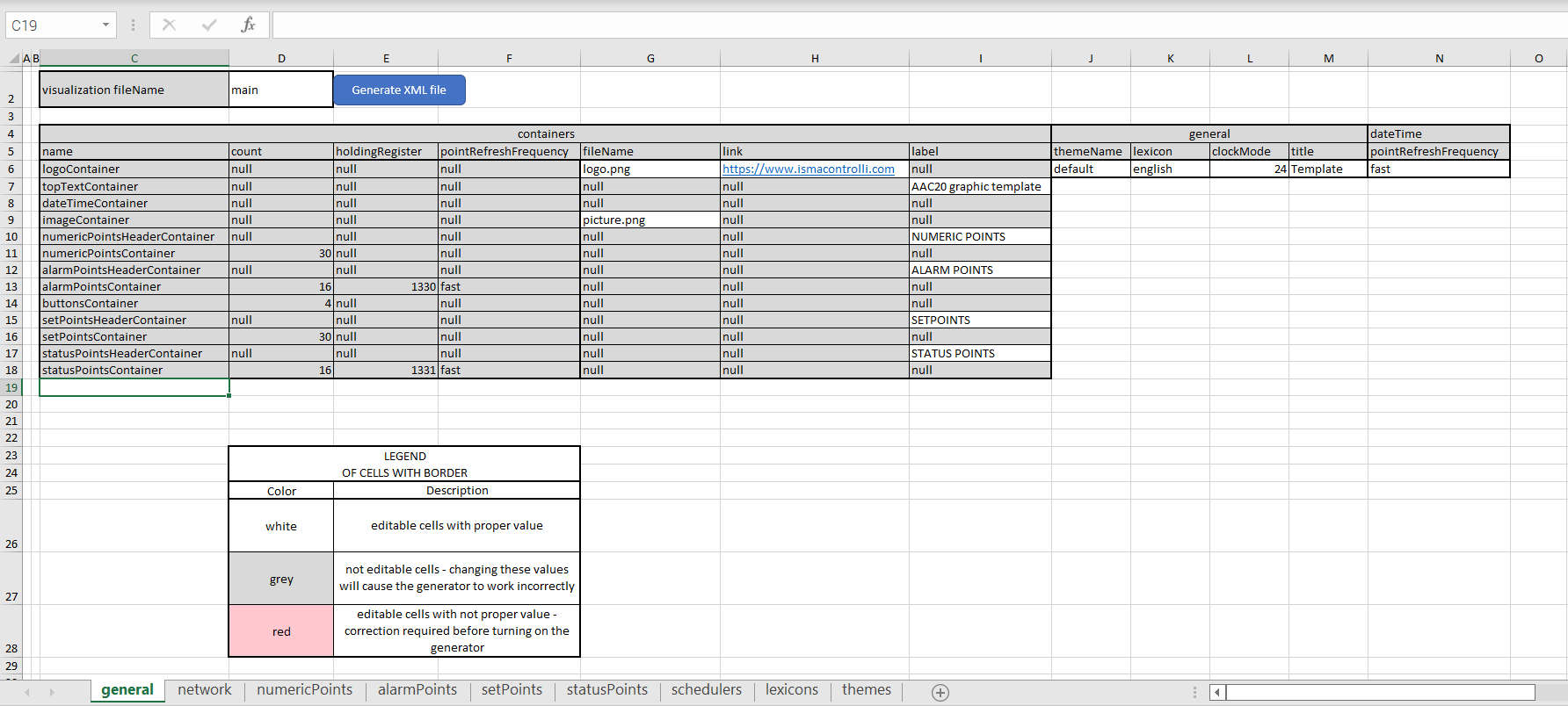 The Visualization_configurator.xlsm file is a main file for configuration of the visualization web server. It is constructed with separate sheets, which contain tables prepared to configure different functionalities of the visualization web server. Each sheet includes a legend table, which explains functions of colored cells in tables:
