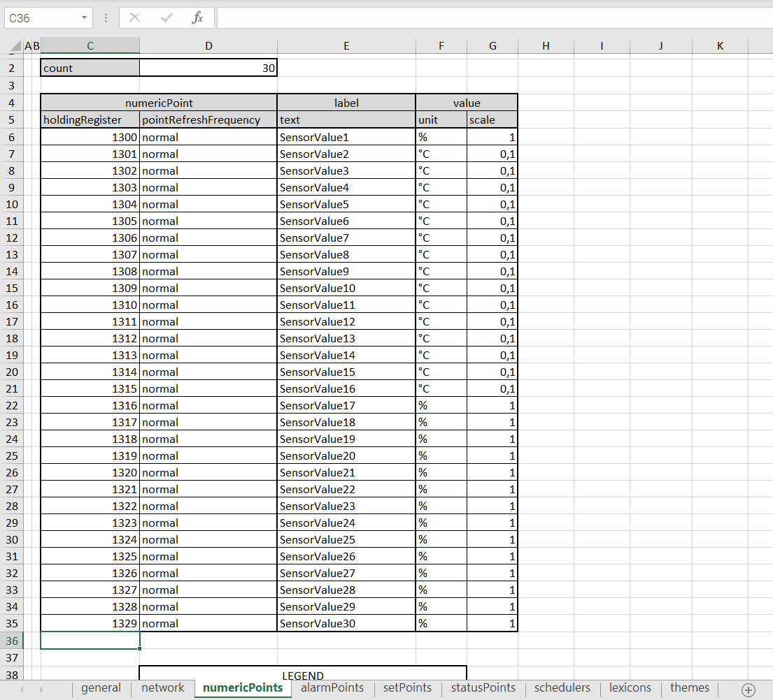 Note: Please note that, although possible, it is not recommended to change the default addresses of these holding registers. Holding registers are linked to components in the app.sax file. Each change of addresses in the .xlsm file must be synchronized with the application in the iSMA Tool.