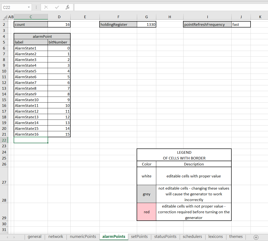 The maximum number of alarm points is set to 16. To set the number of visible displayed number alarm points, fill the "count" cell. All alarm points use 1 holding register. Polling frequency can be set for reading points (fast, normal, slow).