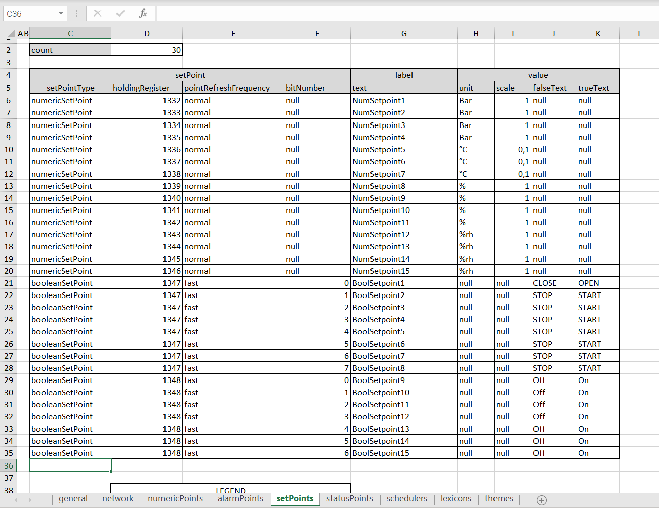 The maximum number of all setpoints is 30, no matter what type of variables is used (numeric setpoint or Boolean setpoint). To set the number of displayed setpoints, fill in the "count" cell.