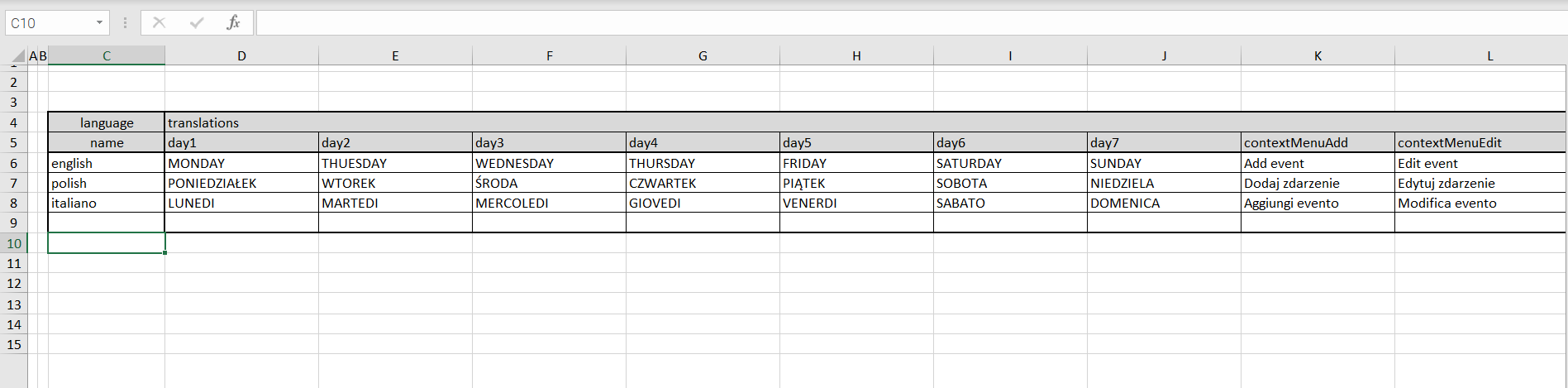Note: All translated terms have to be put in one row, which refers to a language defined in the first column.
