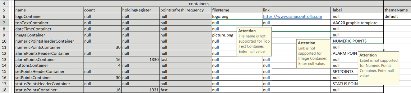 Please also note that if a null value is entered in a predefined field (for example, in the imageContainer row, fileName column, where the picture.png is a default content), then, despite the attention note, the image container will be removed from the visualization.