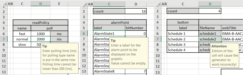 Also, each cell in tables has a Tip or Attention note assigned. These notes contain indications on a purpose of each field or restrictions of the fields edition.