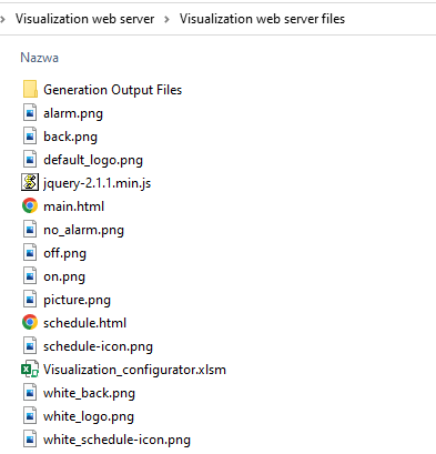 - Generation Output Files folder: created upon using the Generate XML File button in the Visualization_configurator.xlsm file; contains all files necessary for the configured web server to operate properly;