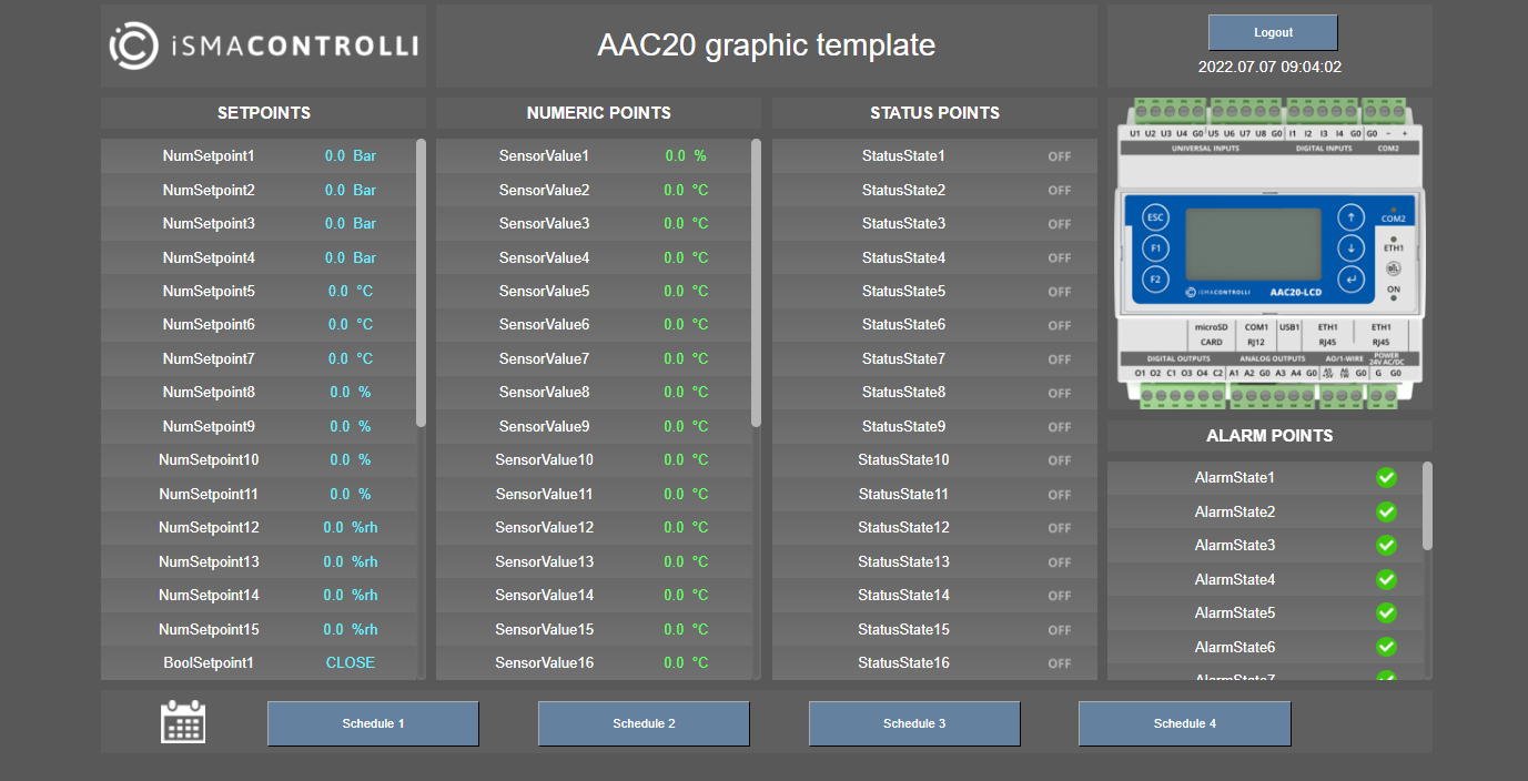 - Having properly logged in, the Internet browser redirects to the index.html file. If no such file has been installed in the internal flash memory, the browser shows a standard diagnostic and configuration web page for the iSMA-B-AAC20 controller.