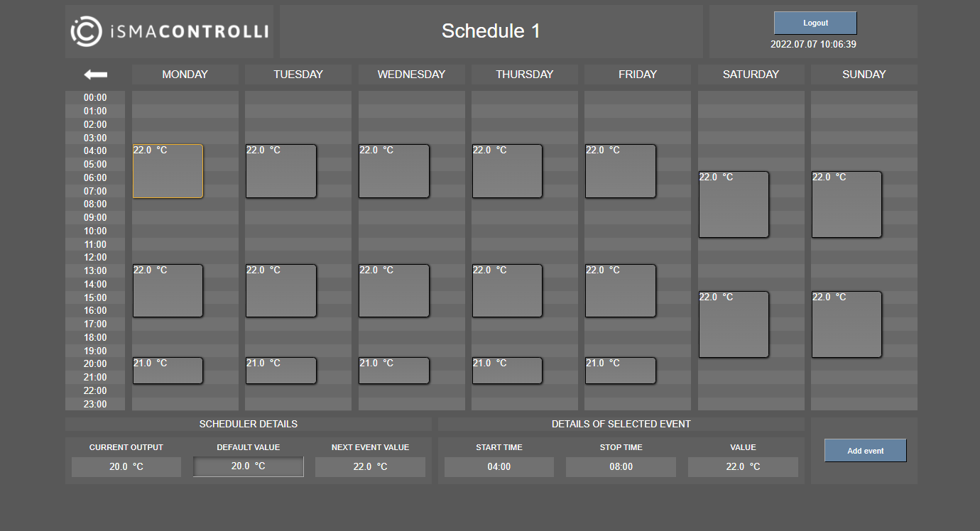 The schedule view displays a weekly view of events per 24 hours. The view is fully editable in terms of adding, editing, copying/pasting, and removing events.
