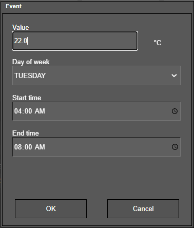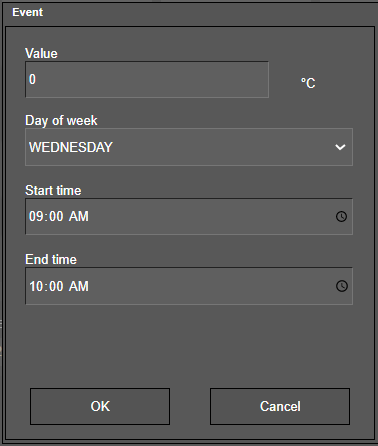 The dialog window allows to set the event's current value, day of week, and time. Confirm with OK to add the event.