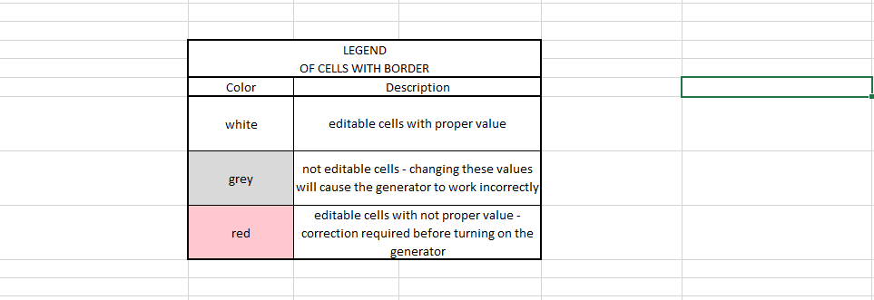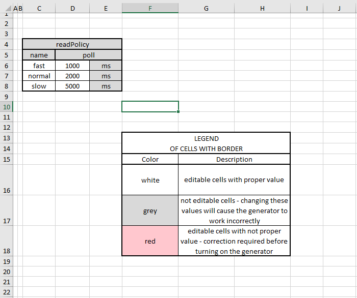 The Visualization_configurator.xlsm file is a main file for configuration of the visualization web server. It is constructed with separate sheets, which contain tables prepared to configure different functionalities of the visualization web server. Each sheet includes a legend table, which explains functions of colored cells in tables: