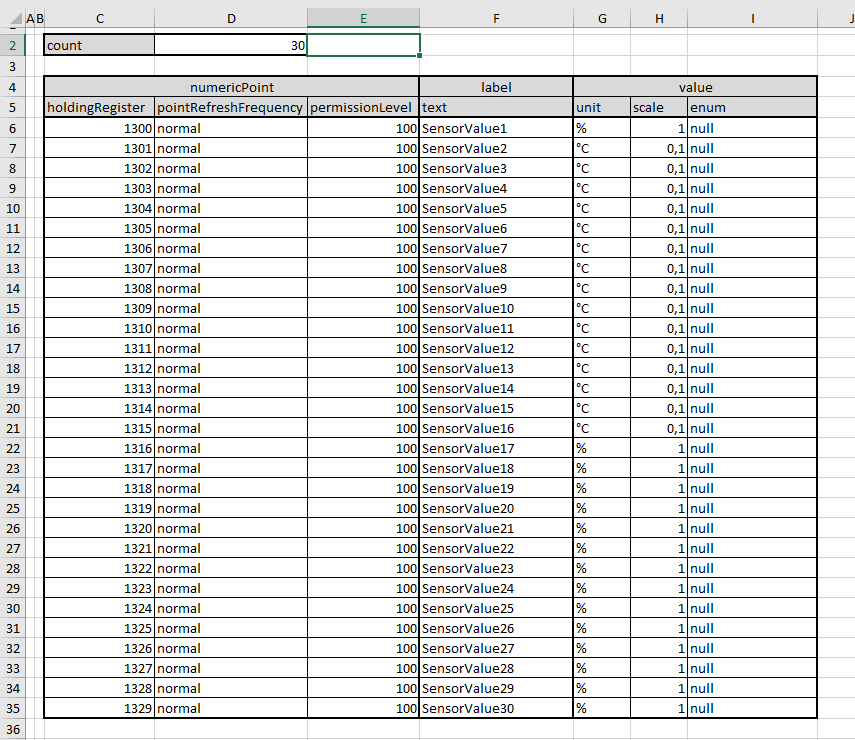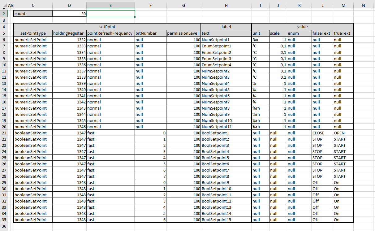 The maximum number of all setpoints is 30, no matter what type of variables is used (numeric, Boolean, or enum setpoint). To set the number of displayed setpoints, fill in the "count" cell.