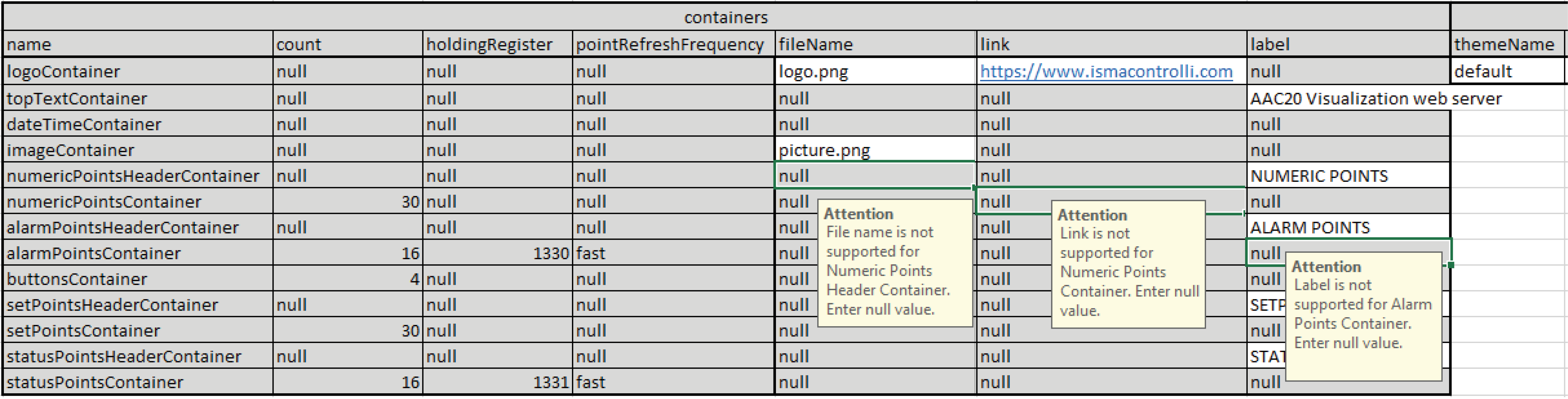 Please also note that if a null value is entered in a predefined field (for example, in the imageContainer row, fileName column, where the picture.png is a default content), then, despite the attention note, the image container will be removed from the visualization.