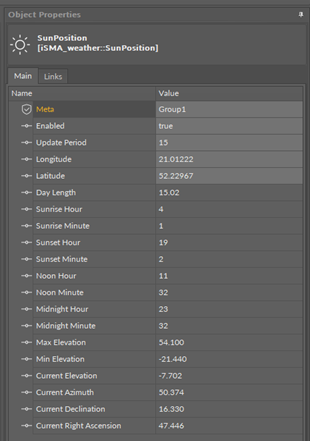 The SunPosition component calculates a current sun position based on the current time and geographical coordinates. The Internet connection is not required for its proper work.