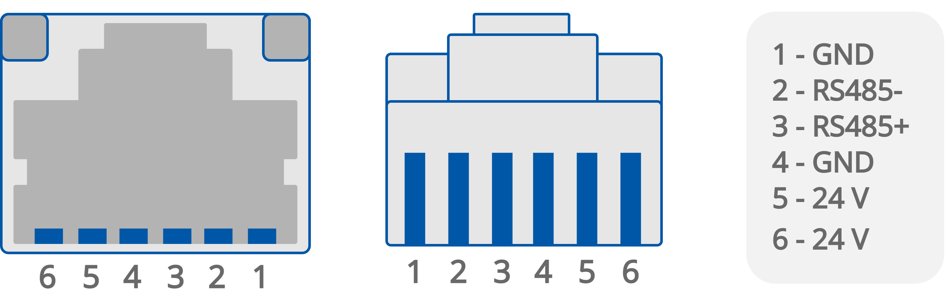 The RJ12 socket is designed for connecting external modules, Modbus devices, and room/wall panels. The FCU device has two parallel RJ12 sockets (RS485 interface in a switch mode) with the same pin configuration. These sockets provide communication in the Modbus RTU protocol.