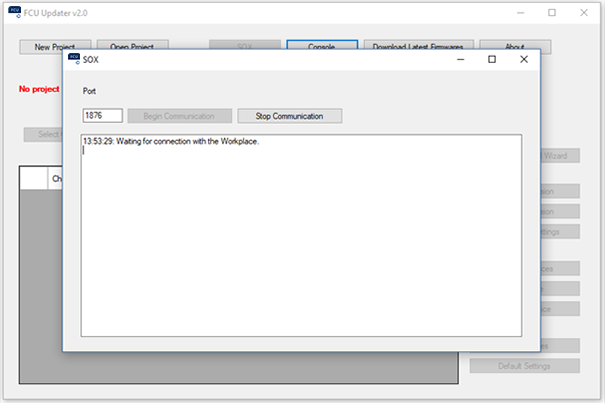 Connect the iSMA-B-FCU device to the USB port in your computer–SOX and Console buttons should be active, which means that the FCU Updater is communicated with the iSMA-B-FCU device.
