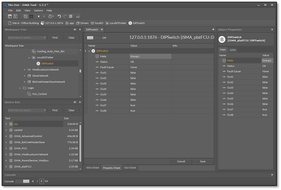 The DIPSwitch is a component designed to read states of eight binary signals set by the CFG DIP switch, mounted in the iSMA-B-FCU device. Using the CFG DIP switch is recommended to manage the configuration of the application. The DIPSwitch component has to be placed under the LocalIO component.