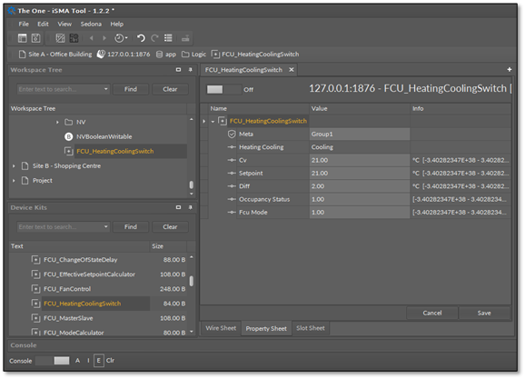 - Heating Cooling: the main output of the component; shows the operating status of the component–whether it works in cooling mode (false) or heating mode (true);