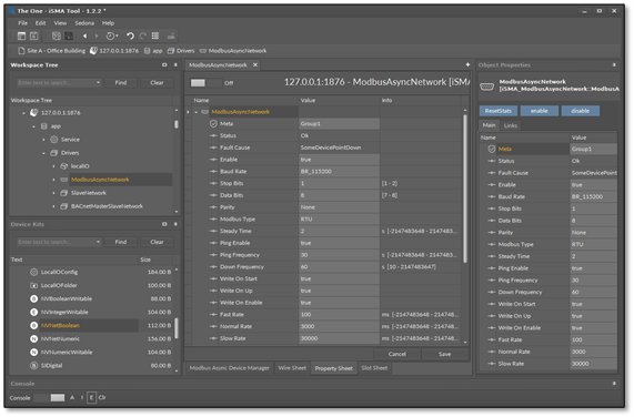 The Modbus network is the main component responsible for servicing the RS485 port (COM2). The ModbusAsyncNetwork component has to be placed under the Drivers folder. The ModbusAsyncNetwork sets parameters such as the communication baud rate and data format, testing, etc., and maintains statistical data.