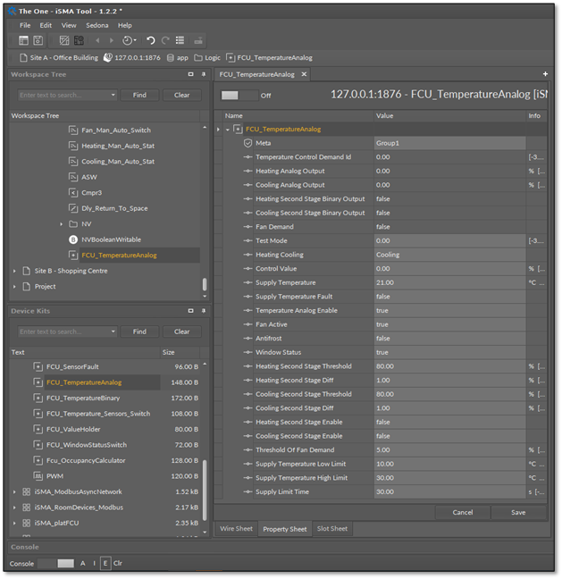 - Fan Active: informs the TemperatureAnalog component that the fan is switched on; if the slot is set to false, analog outputs (the Heating Analog Output and Cooling Analog Output slots) are set to 0, and binary outputs (the Heating Second Stage Binary Output and Cooling Second Stage Binary Output slots) are set to false–these slots can be set to other values (calculated by the main algorithm) only when the Fan Active slot is set to true.