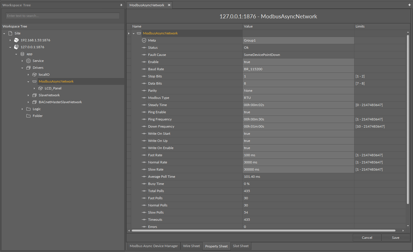 The Modbus network is the main component responsible for servicing the RS485 port (COM2). The ModbusAsyncNetwork component has to be placed under the Drivers folder. The ModbusAsyncNetwork sets parameters such as the communication baud rate and data format, testing, etc., and maintains statistical data.
