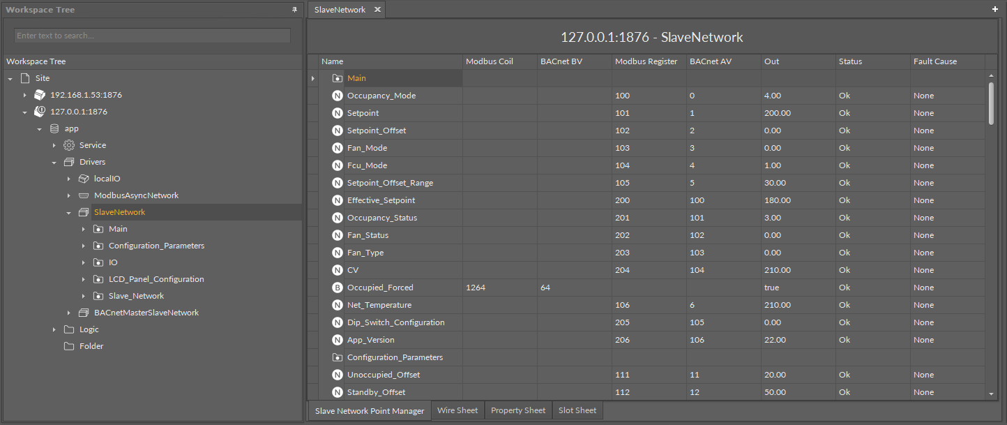 The SlaveNetwork component is used to manage the BACnet MS/TP or Modbus RTU/ASCII protocols, using the RS485 port. The SlaveNetwork component has to be placed under the Drivers component.