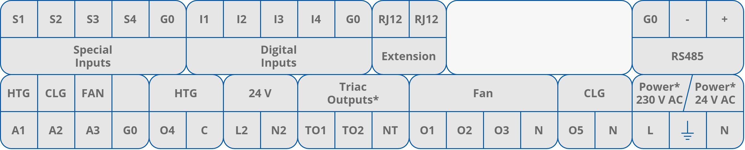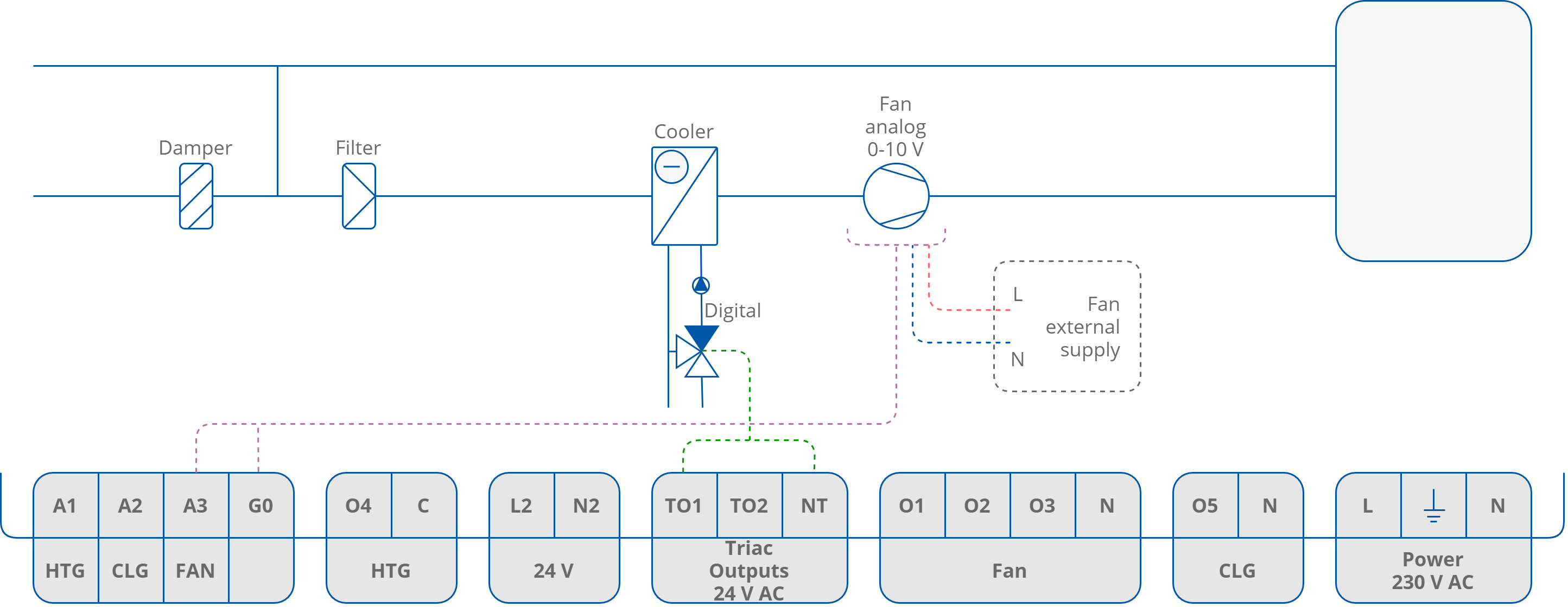 The 24 V power source for heater and cooler actuators can be taken from L2/N2 connectors.