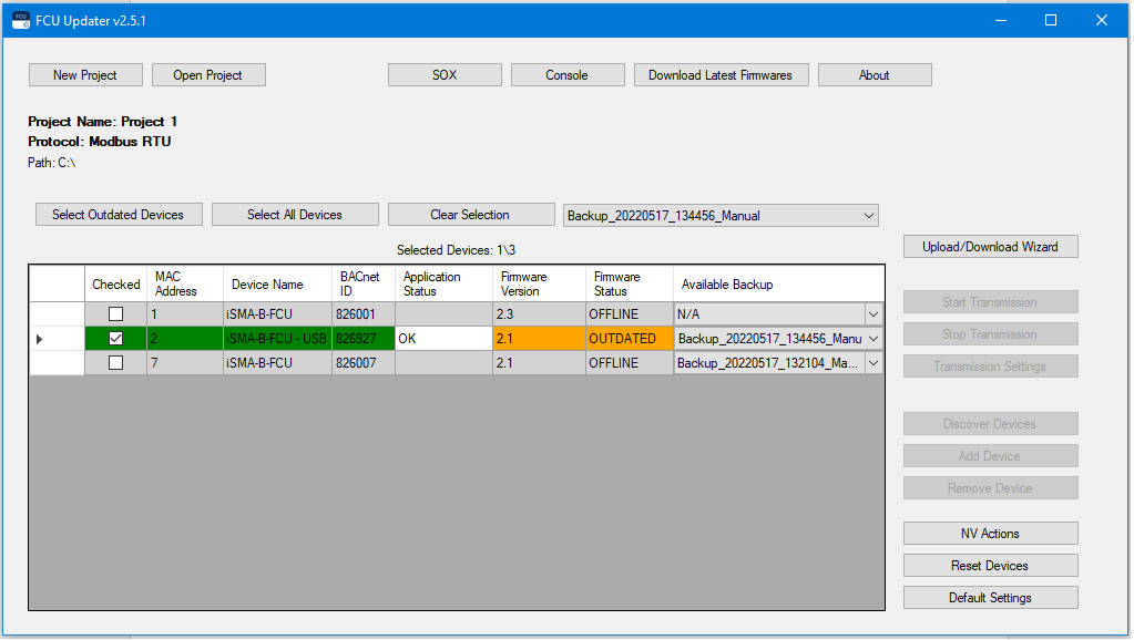 FCU Updater is a project-oriented application, which means that the whole network configuration parameters, iSMA-B-FCU controllers with their application backups and firmware versions, are stored locally inside the project folder for later reuse.