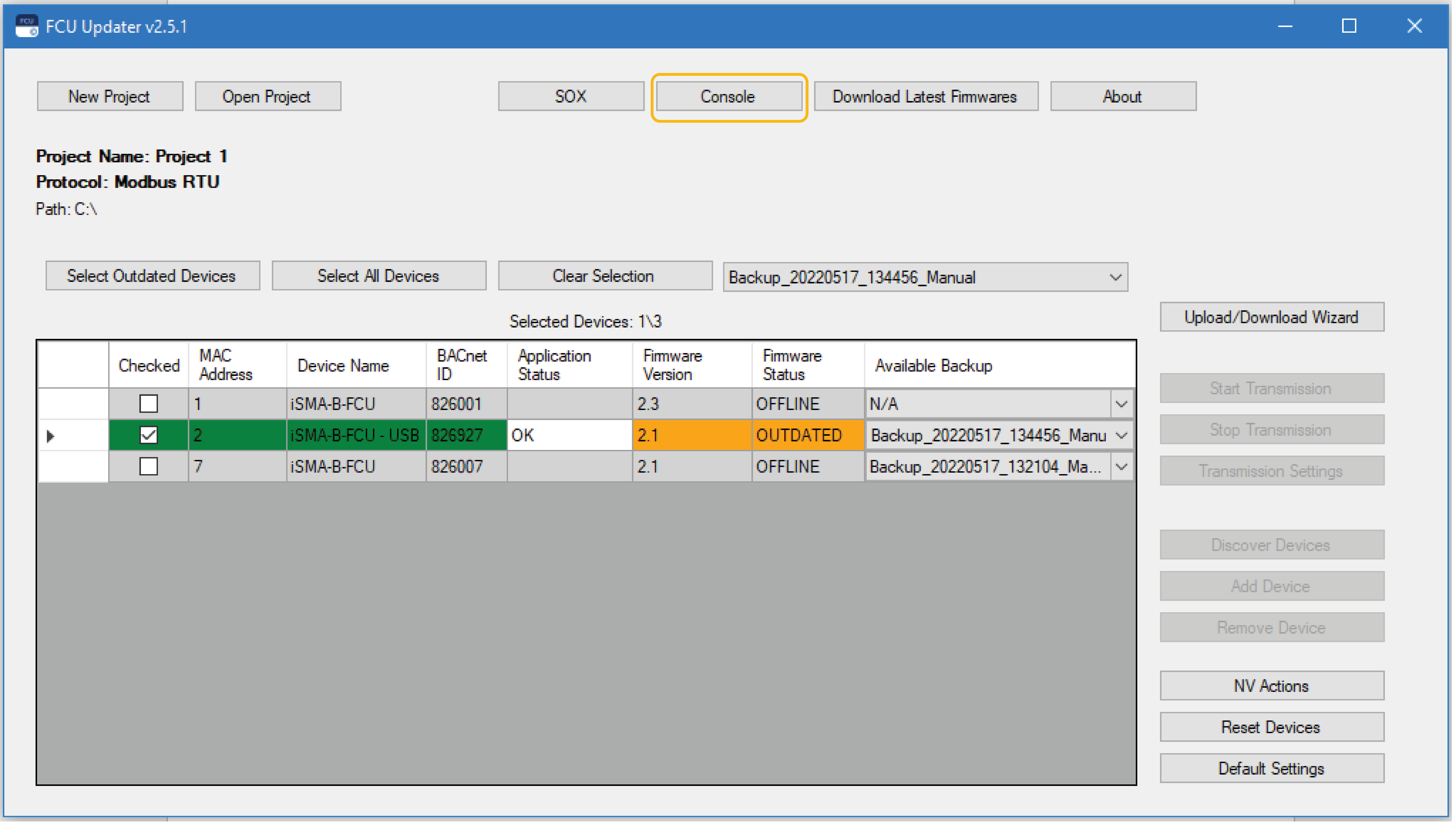 The console allows viewing internal system logs of the directly connected iSMA-B-FCU device. The console can only be used, if the device is connected to the PC directly by the USB cable even without opening any project.