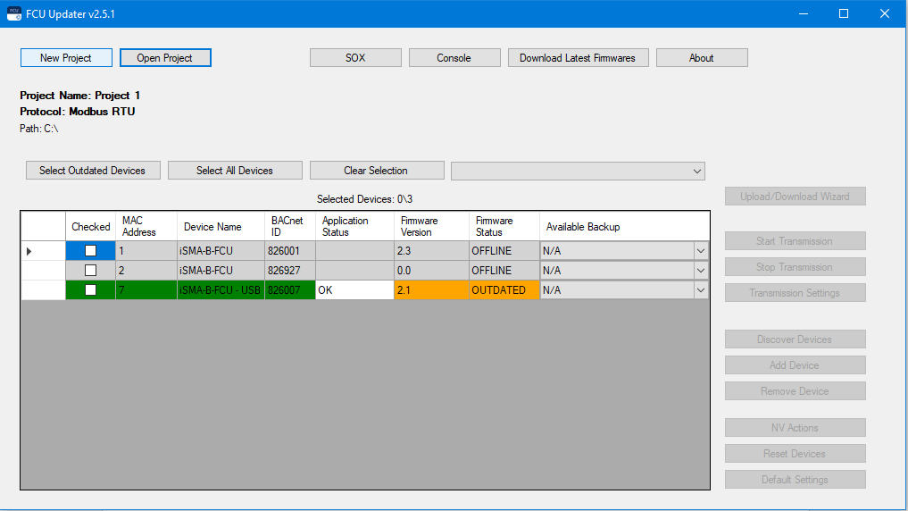 Note: Direct connection of the device by USB cable adds this controller automatically to the projects list for the future use, see the picture above with added iSMA-B-FCU controller. Please note that, after disconnecting the USB cable, it is necessary to restart the connection with the bus by pressing the Start Transmission button.