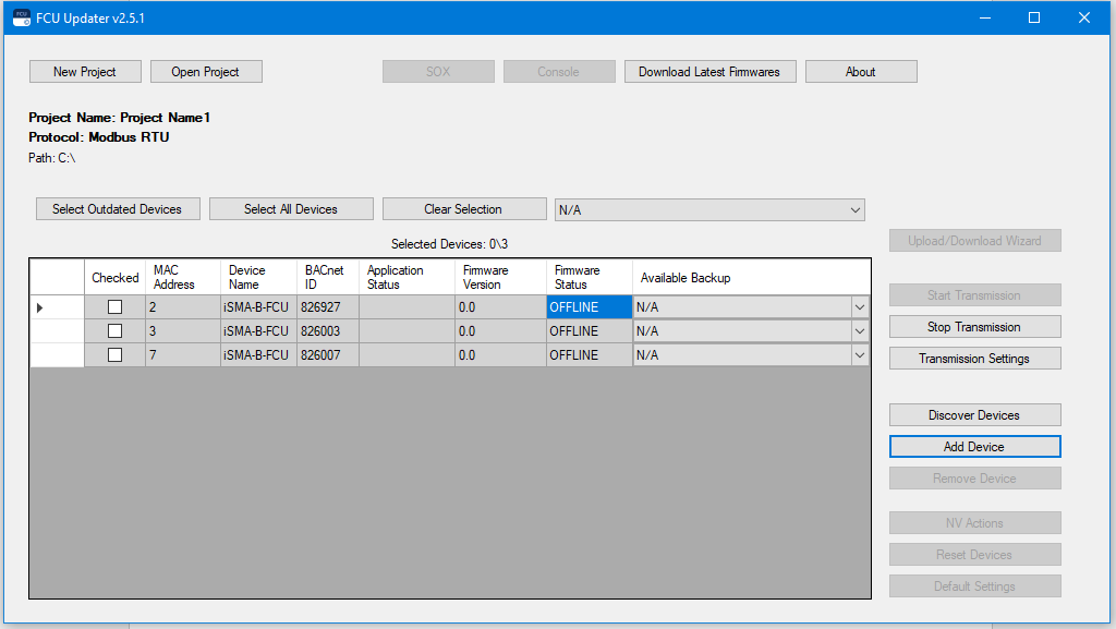 Removing devices from the project allows to select one or more devices and remove them by pressing the Remove Device button. The FCU Updater requires confirmation before removing anything.