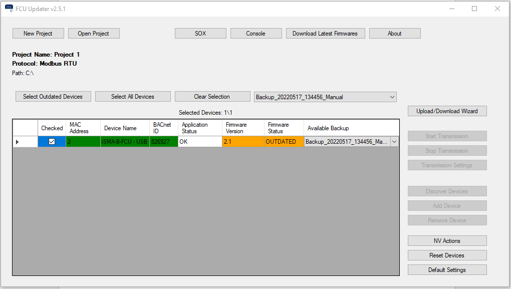 Restarting the selected device or multiple devices by pressing the Reset Devices button sends a special request by the Modbus or BACnet network or by USB (if the controller is connected directly). If the device receives the request, it processes the restart, and the FCU Updater shows the driver status as offline for a moment.