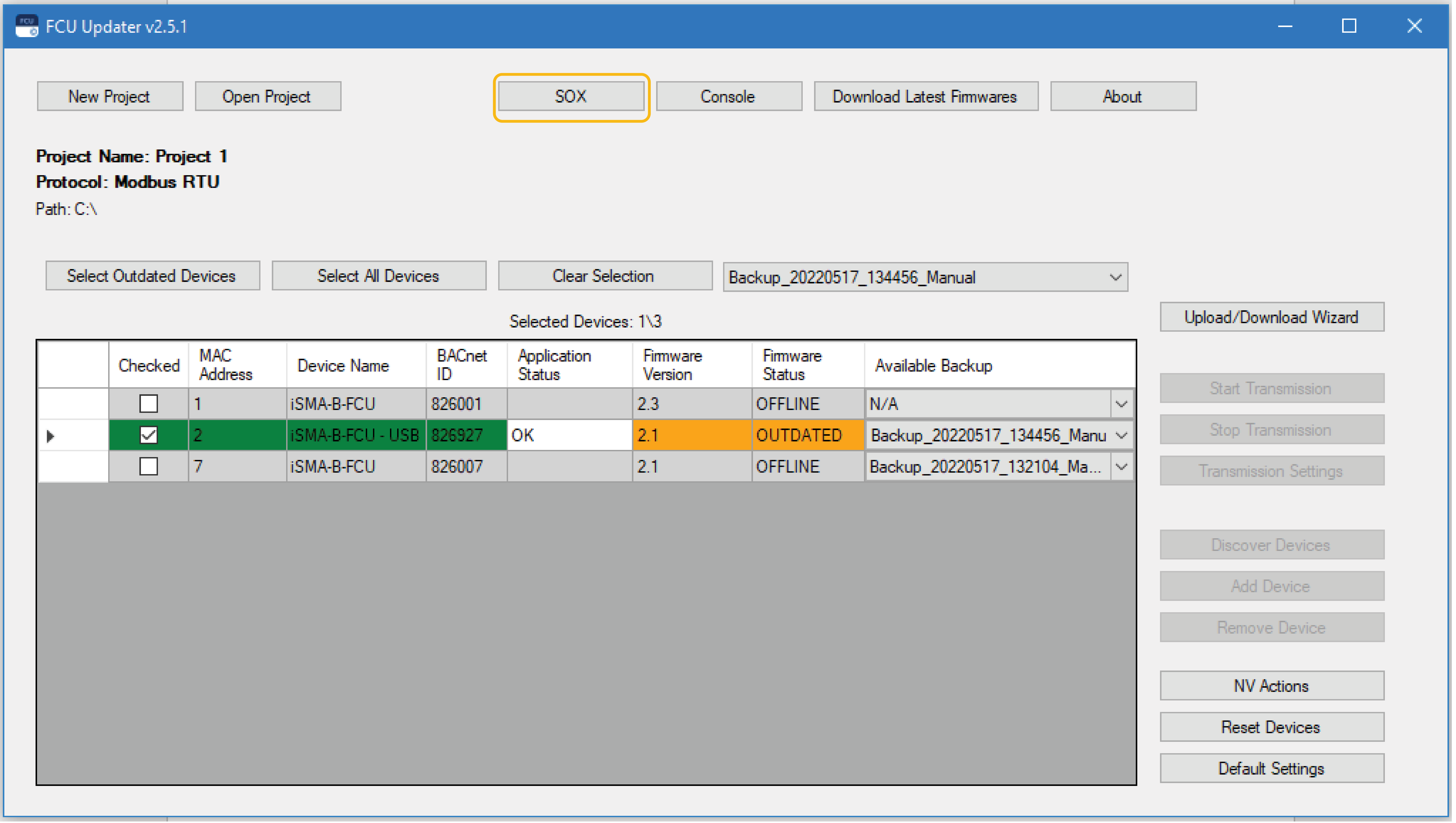 The SOX function allows programming of the iSMA-B-FCU controller online (real-time). The controller must be connected directly via the USB cable as described above. The SOX button is always enabled each time the USB cable is connected directly to the iSMA-B-FCU controller, and, moreover, opening of any project is not required.
