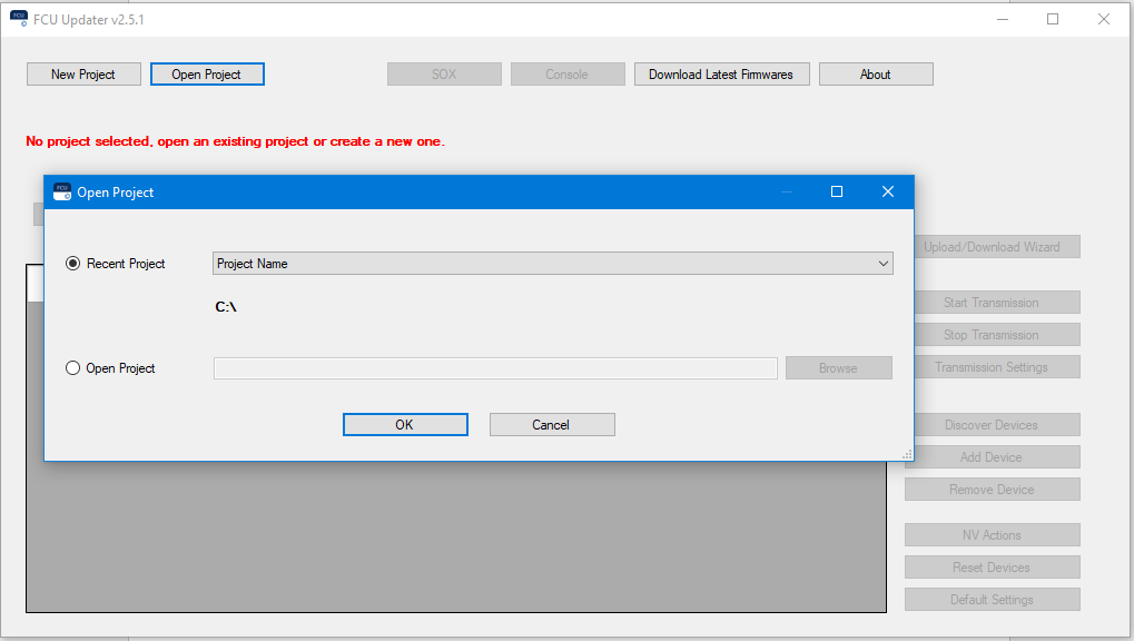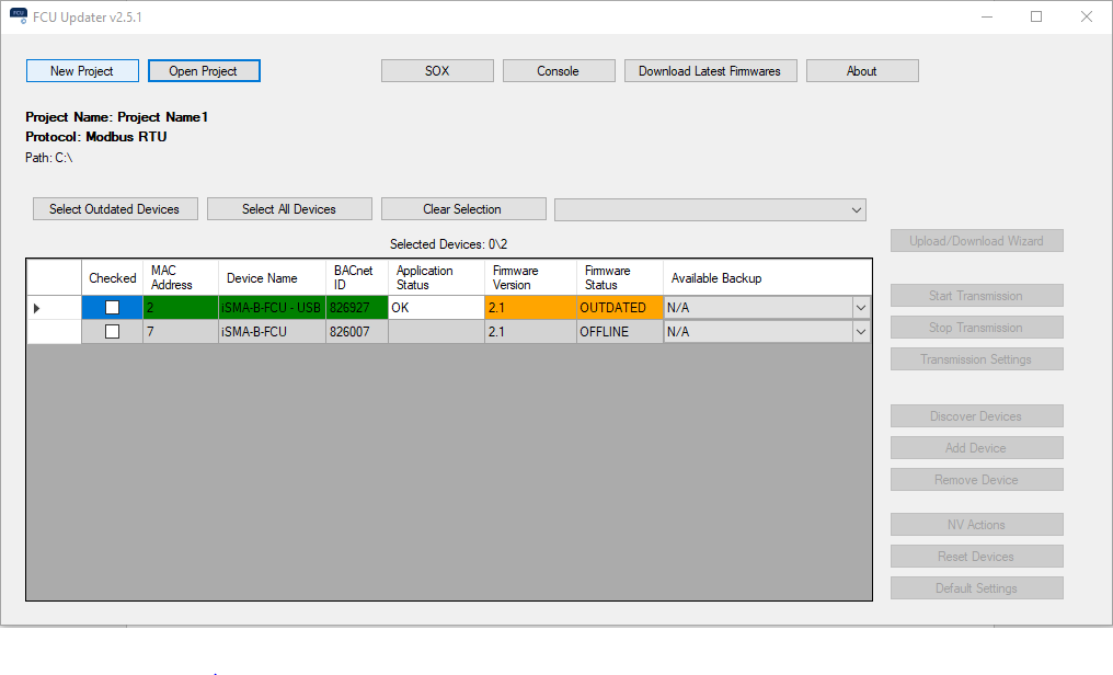 Now, the project is opened. The FCU Updater displays the current context by showing a confirmation of the opened project: its name, location, and setup transmission protocol. All that information appears on labels located under New Project and Open Project buttons. Also, all the information about devices name, type, versions, backups previously saved in the project folder appears in the main table on the application screen.