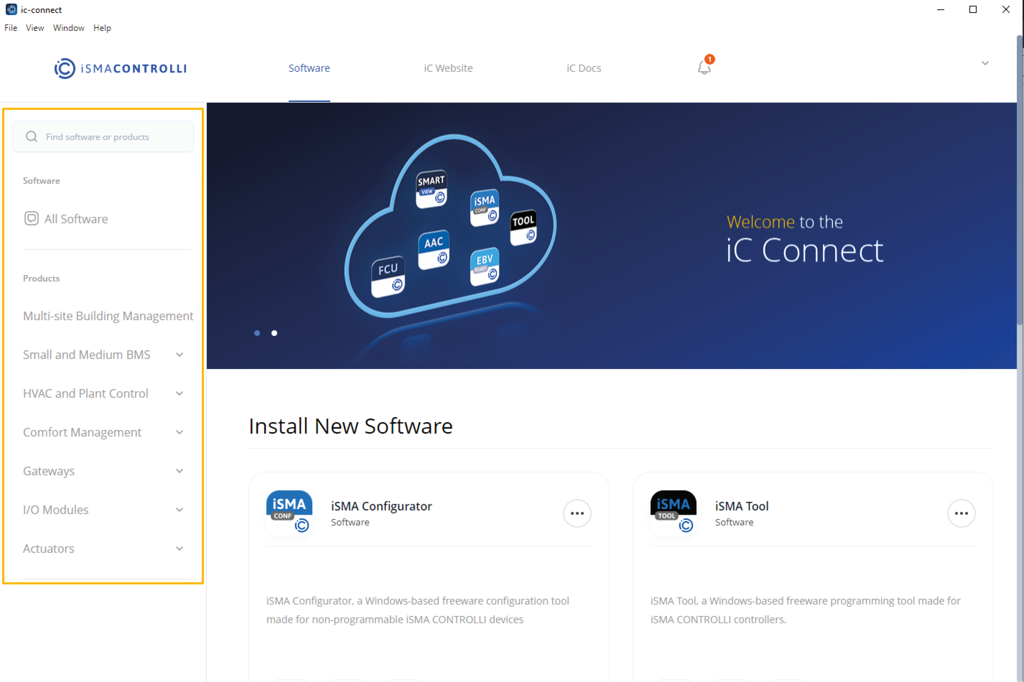 The iC Connect tool is very intuitive. On the start screen, there is an access panel for software or products (grouped by iSMA CONTROLLI solutions). A search bar is available on the top of the panel to enhance user convenience (it is possible to search by software or product).