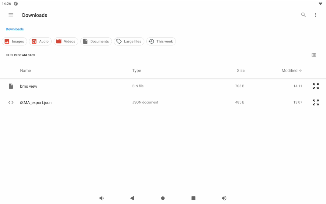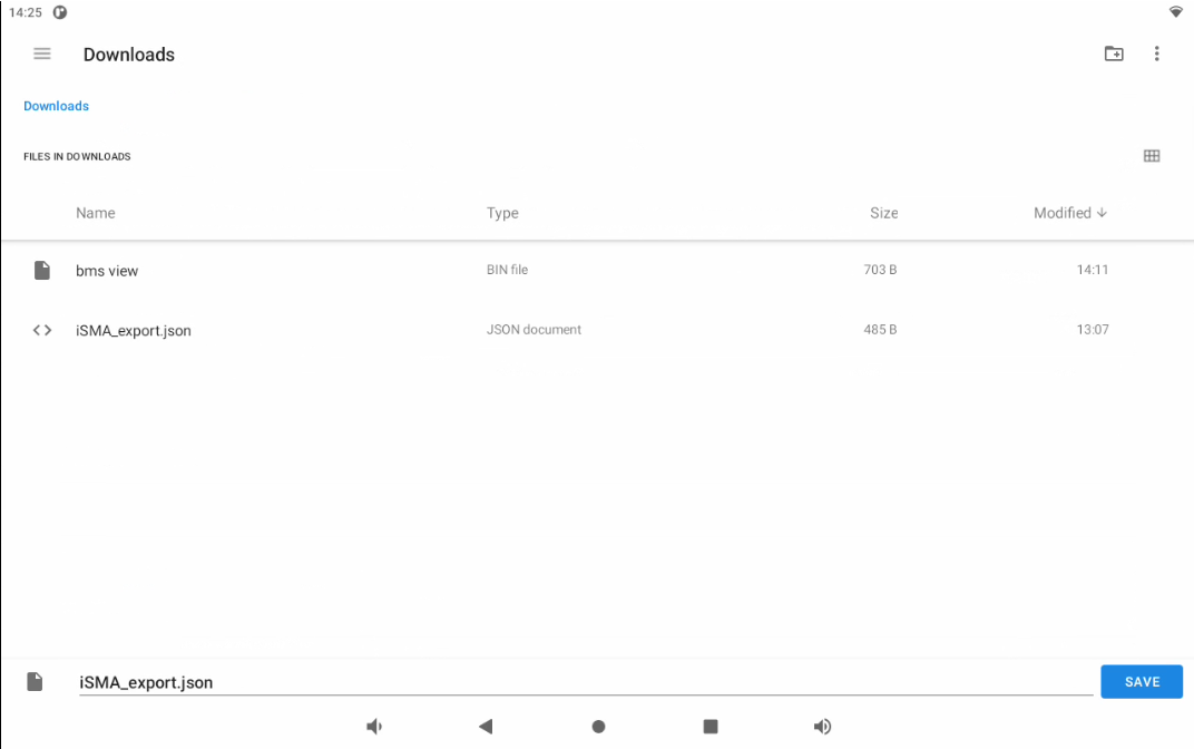 Step 2: New window shows up. A default name of the file is ’iSMA_export.json‘ but it is freely editable; also at this point the user has to pick the location of the file (touch the three dashes icon in the left top corner of the screen).