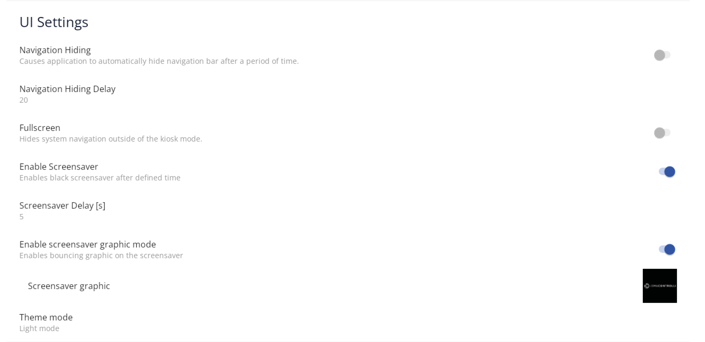 Screensaver graphic: allows to select a file, which will be floating on a screensaver; by default, it is the iSMA CONTROLLI logo; supported formats: .png, .jpg;