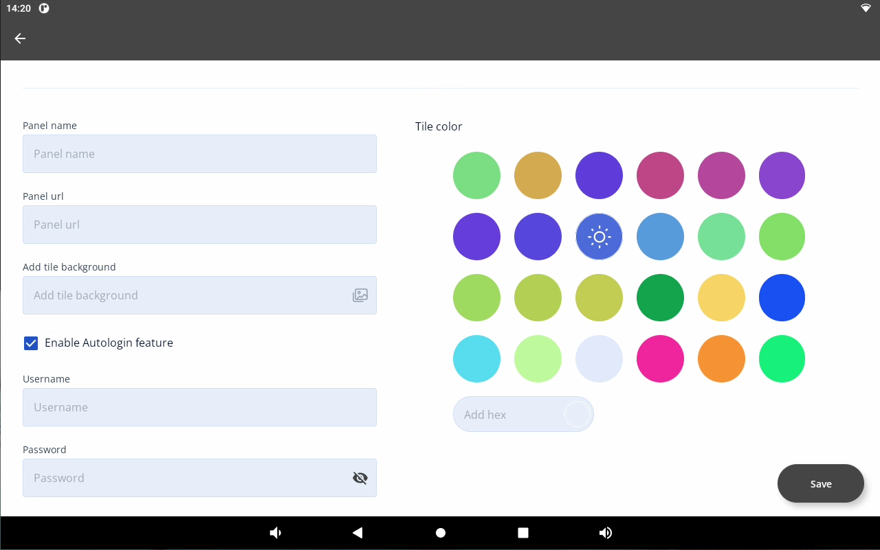 Checking the Enable Autologin feature extends the username and password fields. Saved, the credentials are remembered, and the view is automatically logged from the panel. If the option remains unchecked, logging in is redirected to an external login website (Niagara or other).