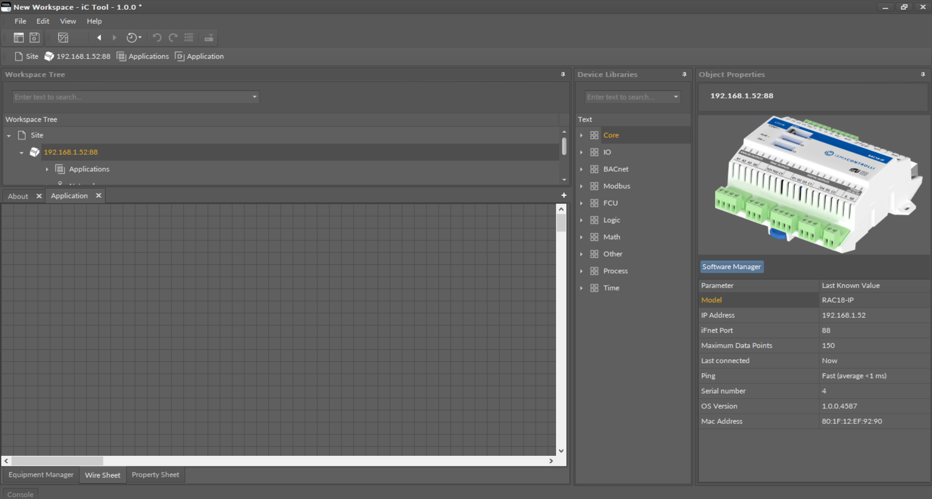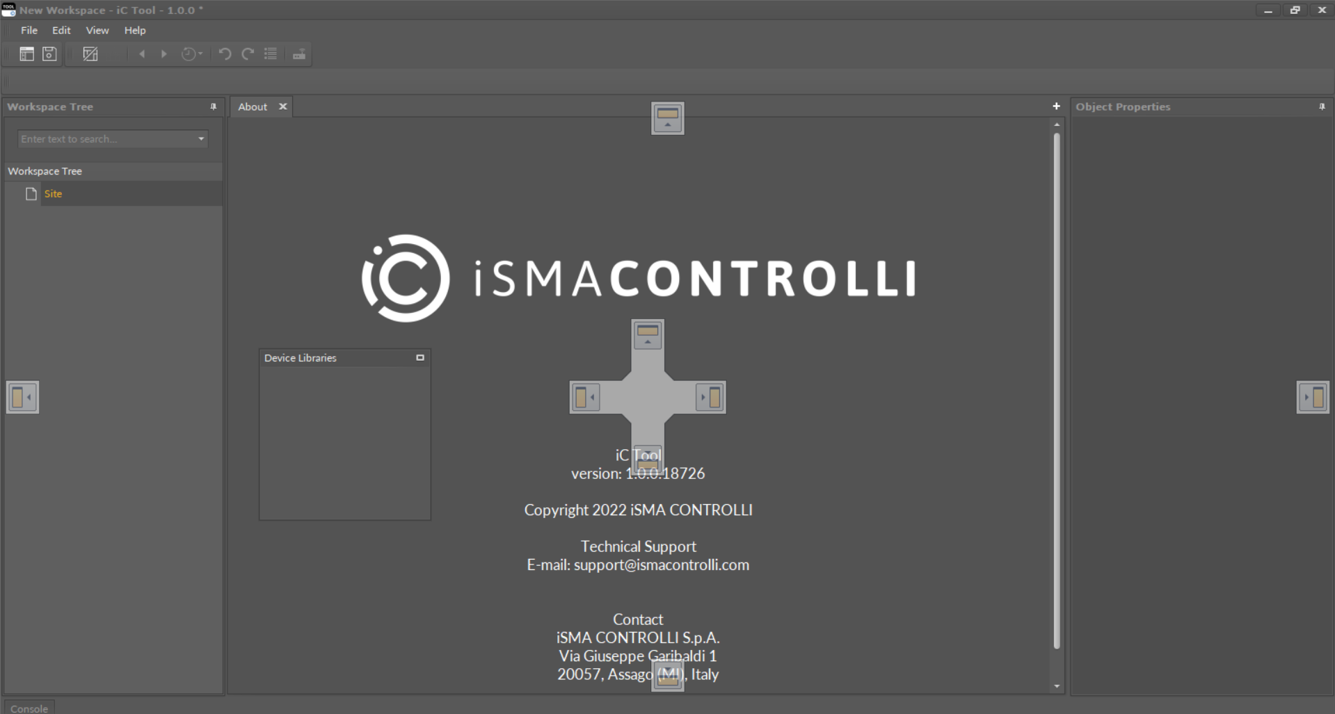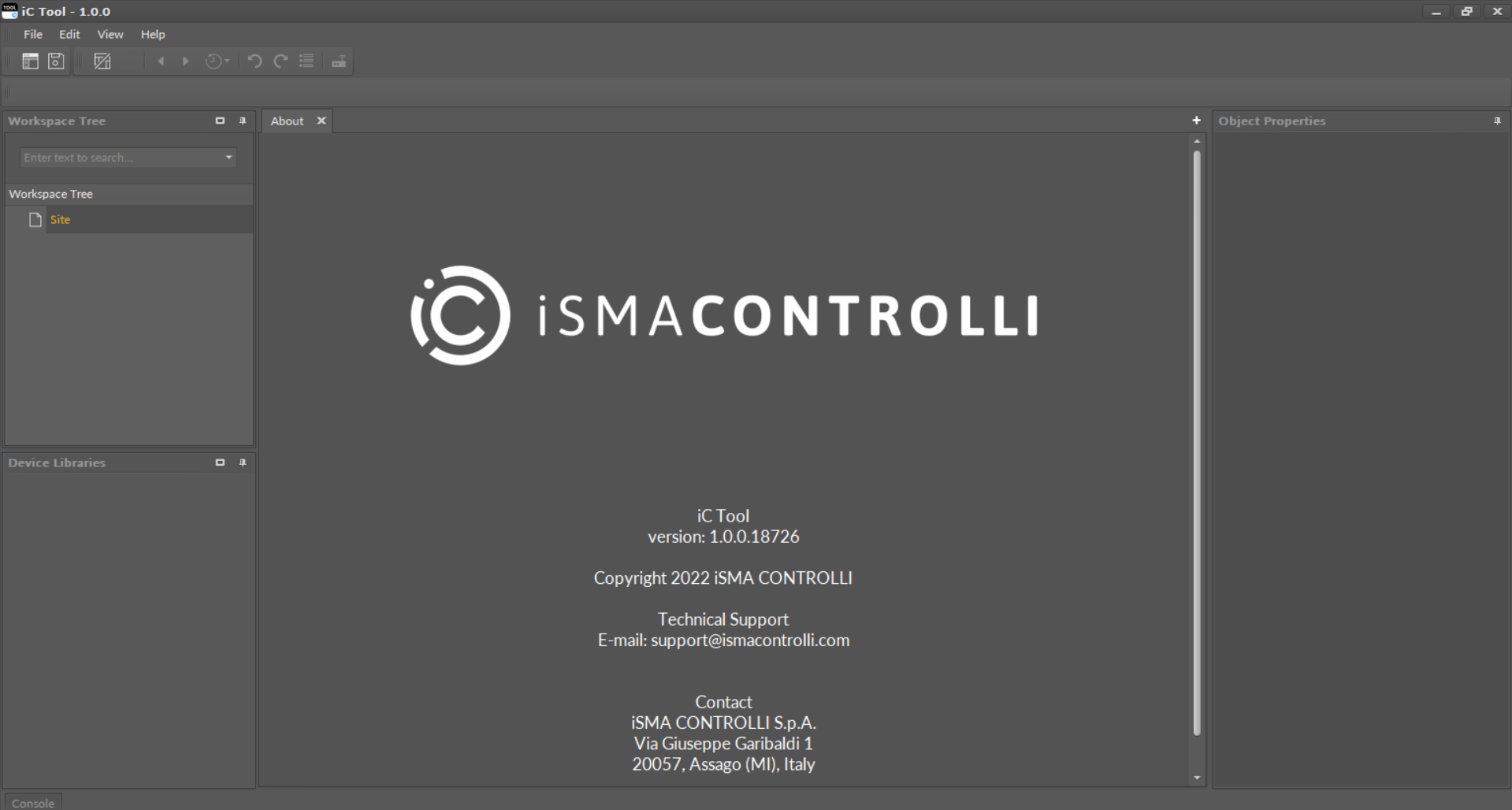 In the default settings of the iC Tool, the upper left side of the screen is occupied by a Workspace Tree window. Below is a Device Libraries window showing current libraries of the connected device. Central part of the screen is occupied by a Main screen, a space where the application’s views are shown on tabs, which is discussed further. After the iC Tool activation, the Main screen shows program information shown on the figure above. On the right of the Main screen there is an Object Properties window. The Console window is by default minimized. It is accessible as an expandable tab in the bottom left corner of the iC Tool .