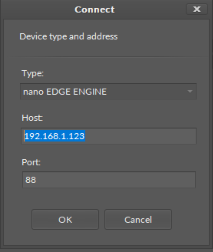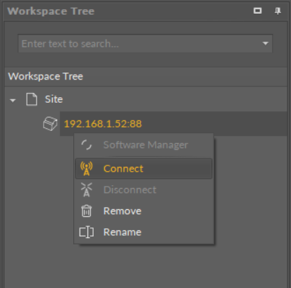 To connect the device, it needs to be added to the Workspace Tree: right-click anywhere in the Workspace Tree window, and add a new project from the context menu (in case the required project is already added, omit this step). Then, right-click on the project, and select the Add Device option from the context menu, which opens a dialog window allowing to configure basic connection data: