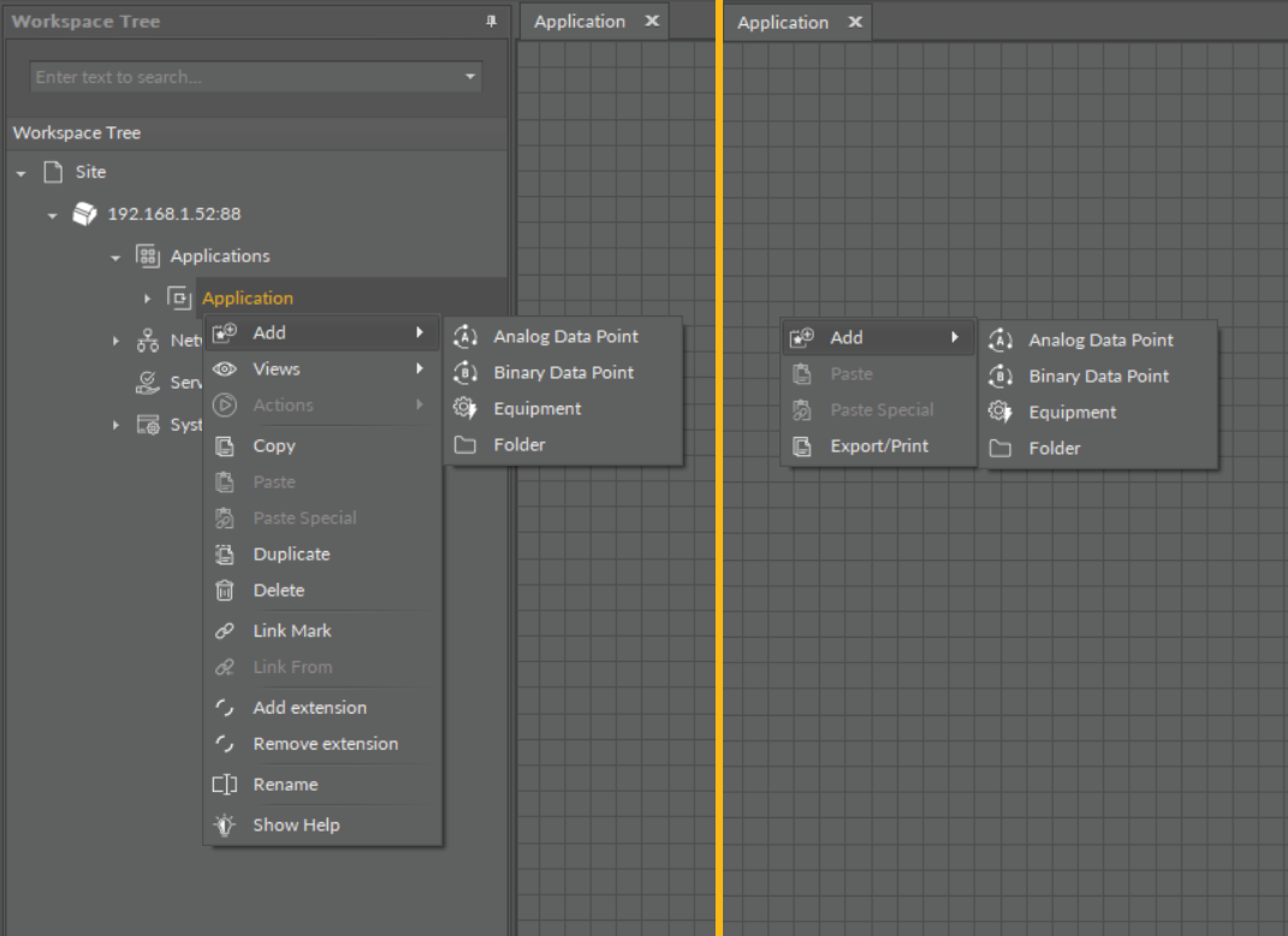 The Workspace Tree window, the Wire Sheet and Property Sheet views offer a special way of adding Data Points and folders (the Folder and Equipment components) to the Application, simply from the context menu. In order to add components this way, right-click in an empty space of the Wire Sheet grid or Property Sheet and choose the Add option from the context menu. In the Workspace Tree, special adding of Data Points and folders is available in the context menu of the Application component. This way of adding Data Points and folders to the Application allows to add a multiple Data Points or folders.