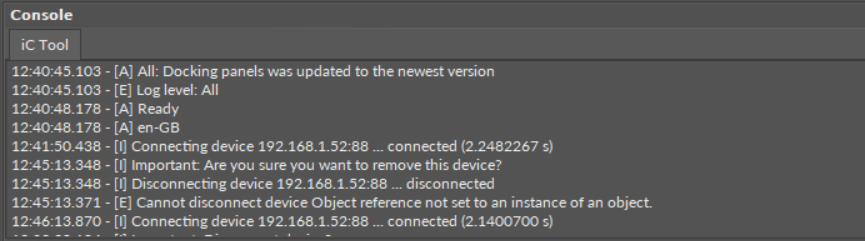 While performing user’s tasks or processes such as object removal or establishing connection with a controller, the Console window shows the logs of what is being performed at the moment.