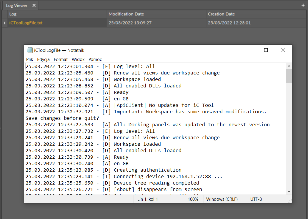 The iC Tool allows to view its log file saved on the hard drive. To see the iC Tool logs, go to the main menu, click the View option, and then the Log Viewer option.