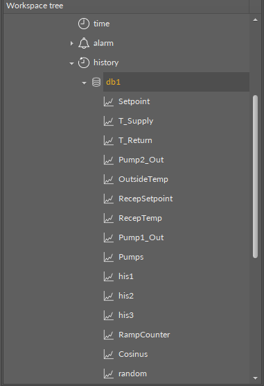 Accessing both views is possible from the Workspace Tree at app -> service -> history -> db1. Under the db1 component, which is a historical database, there are historical variables registered in the iC Tool shown by components (see the figure below).