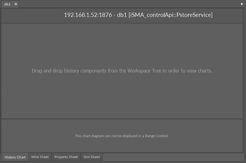 The second method of working with historical data is expanding the db1 component and dragging the component we are interested in from the Workspace Tree to an empty History Chart view. The figure below shows the empty History Chart view of the db1 component before selecting the component to present its historical data.
