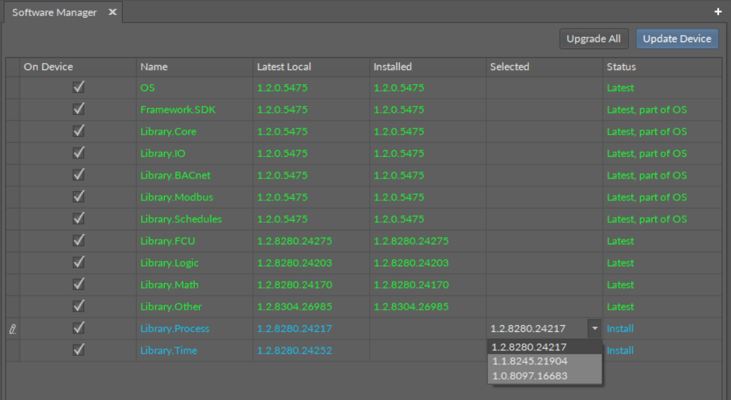 In order to upgrade or downgrade the selected element, choose the desired version of the element in the Selected column, and press the Update Device option (highlighted in blue in the right upper corner of the Software Manager). This option executes all actions indicated in the Status column.