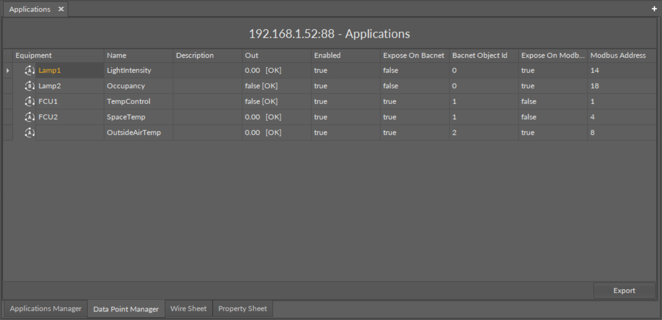 The Data Point Manager view is also automatically opened if either the Applications container or the RAC18-IP (Device for BACnet or Modbus) component is double-clicked in the Workspace Tree window.