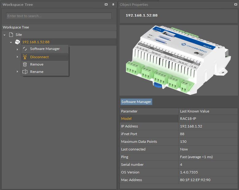 To disconnect the device, select it on the Workspace Tree and choose a Disconnect option from the context menu, then accept.